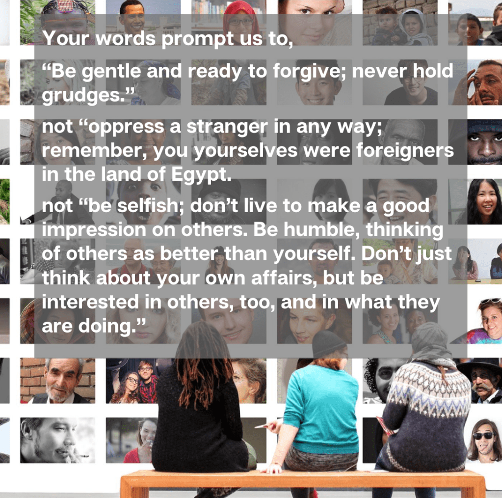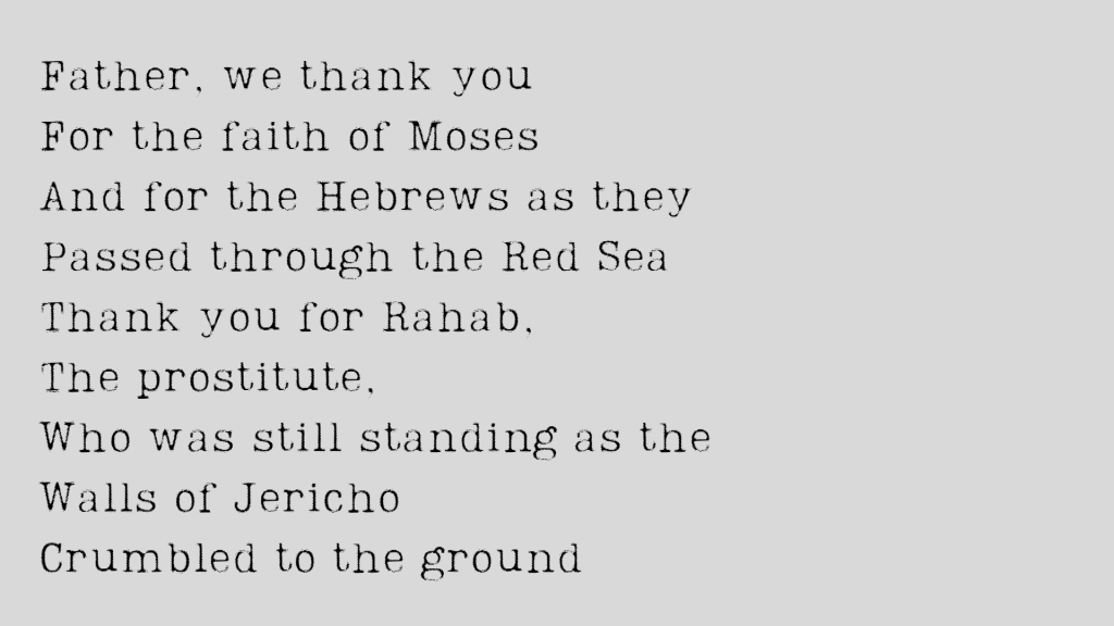 God, we are thankful that you knew the names of every inhabitant in Ninevah crying out for any kind of deliverance, and you knew the name of Noah, Abraham and Sarah, of Isaac and Rebecca, of Jacob, Leah, and Rachel, of the sons of Jacob, including Joseph, and of Shiphrah, Puah, Jochebed, Miriam, and of Bithiah.