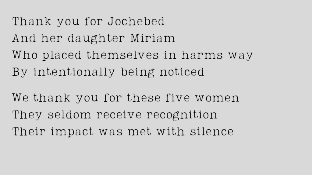 We cannot leave this story of these five heroic women without looking at one final act of bravery. Jochebed, and her daughter Miriam, allowed themselves to be noticed – again, it is best to go under the radar, unnoticed, when you are an oppressed person. It would be nearly impossible to consider the possibility that Bithiah naively accepted the appearance of Miriam as serendipitous. In doing this, both of these Hebrews put their own lives, as well as their families and the life of this beloved infant, in jeopardy. They had allowed themselves to be noticed – this plan of faith required not only risk and release, it required that they place themselves in the crosshairs of a powerful, brutal, and paranoid, ruler.